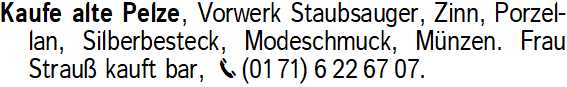 Anzeigentitel: Kaufe alte Pelze, Vorwerk Stau