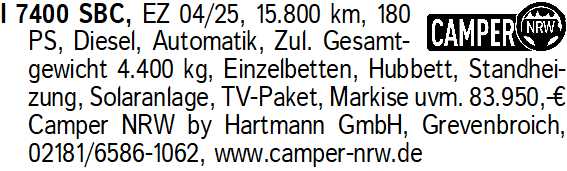 Anzeigentitel: I 7400 SBC, EZ 04/25, 15.800 k
