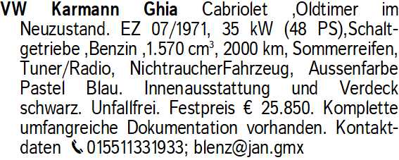 Anzeigentitel: VW Karmann Ghia Cabriolet ,Old