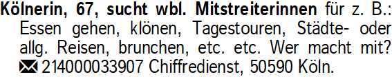 Anzeigentitel: Kölnerin, 67, sucht wbl. Mitst