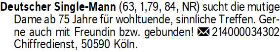 Anzeigentitel: Deutscher Single-Mann (63, 1,7