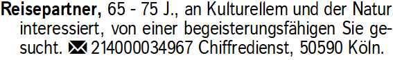 Anzeigentitel: Reisepartner, 65 - 75 J., an K