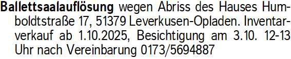 Anzeigentitel: Ballettsaalauflösung wegen Abr