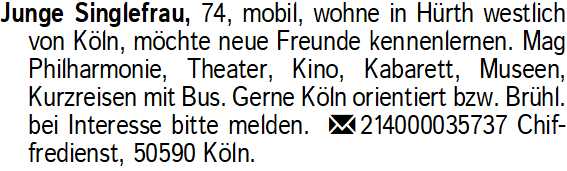 Anzeigentitel: Junge Singlefrau, 74, mobil, w