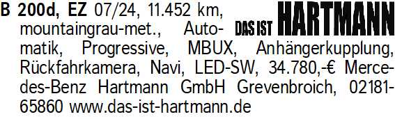 Anzeigentitel: B 200d, EZ 07/24, 11.452 km, m