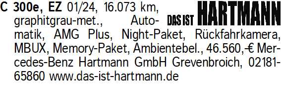 Anzeigentitel: C 300e, EZ 01/24, 16.073 km, g