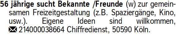 Anzeigentitel: 56 jährige sucht Bekannte /Fre