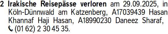 Erscheinungsdatum: Anzeige vom 8.11.2025 in der Rubrik "Verloren/Gefunden"