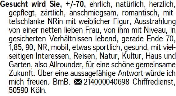 Anzeigentitel: Gesucht wird Sie, +/-70, ehrli