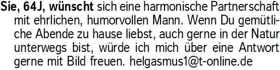 Anzeigentitel: Sie, 64J, wünscht sich eine ha