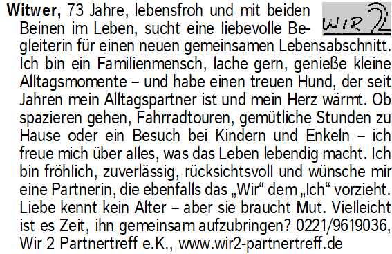 Anzeigentitel: Witwer, 73 Jahre, lebensfroh