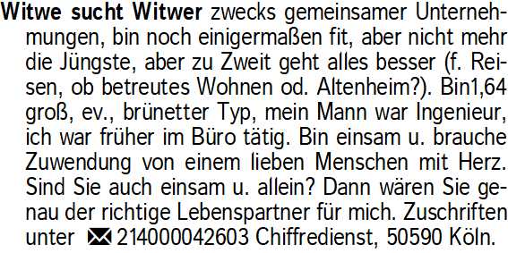 Anzeigentitel: Witwe sucht Witwer zwecks geme