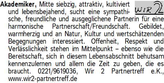 Anzeigentitel: Akademiker, Mitte siebzig, att