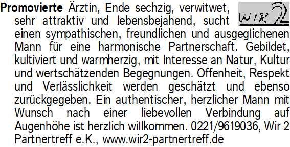 Anzeigentitel: Promovierte Ärztin, Ende sechz