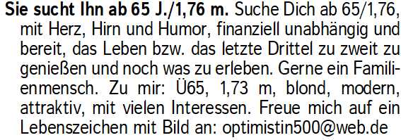 Anzeigentitel: Sie sucht Ihn ab 65 J./1,76 m