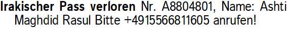 Anzeigentitel: Irakischer Pass verloren Nr. A