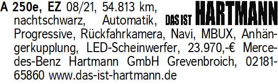 Anzeigentitel: A 250e, EZ 08/21, 54.813 km, n