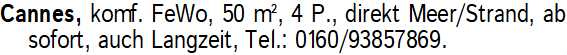 Anzeigentitel: Cannes, komf. FeWo, 50 m , 4 P