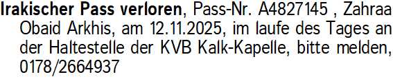 Anzeige vom 14.1.2026 in der Rubrik "Verloren/Gefunden"