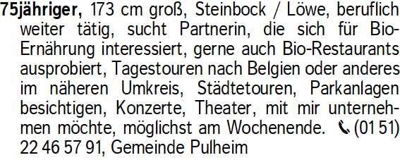Anzeigentitel: 75jähriger, 173 cm groß, Stein
