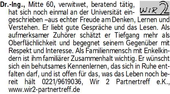 Anzeigentitel: Dr.-Ing., Mitte 60, verwitwet,