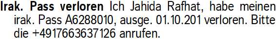 Anzeigentitel: Irak. Pass verloren Ich Jahida