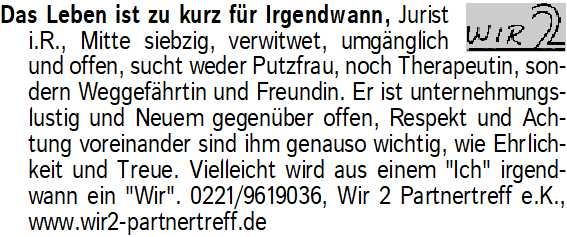 Anzeigentitel: Das Leben ist zu kurz für Irge