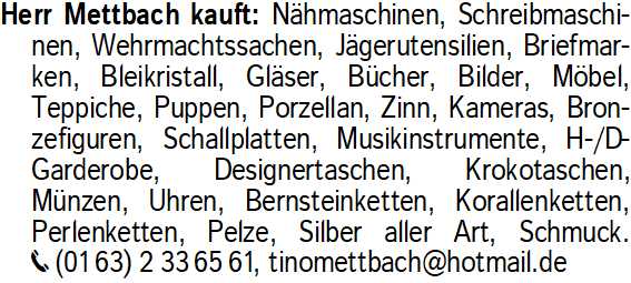 Anzeigentitel: Herr Mettbach kauft: Nähmaschi