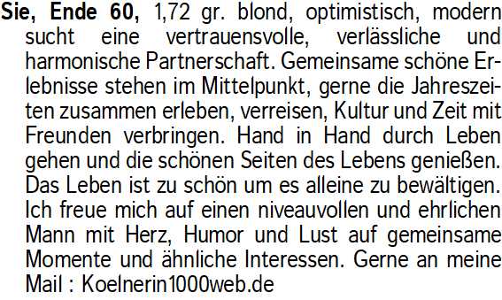 Anzeigentitel: Sie, Ende 60, 1,72 gr. blond,