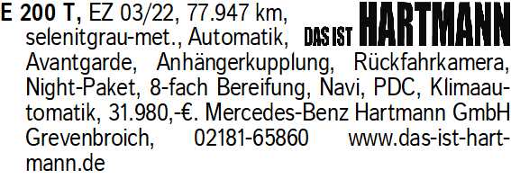 Anzeigentitel: E 200 T, EZ 03/22, 77.947 km,