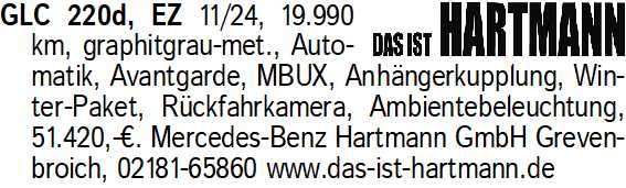 Anzeigentitel: GLC 220d, EZ 11/24, 19.990 km,