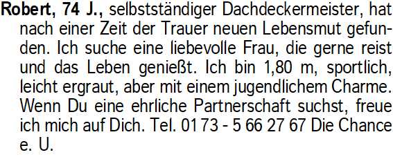 Anzeigentitel: Robert, 74 J., selbstständiger